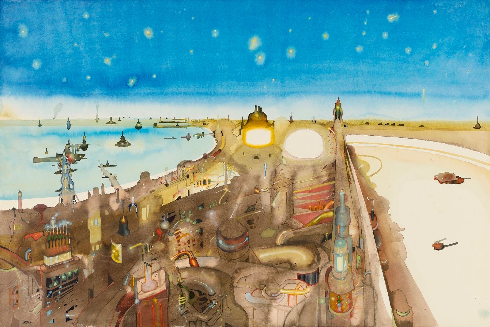 The highly distinctive large scale watercolours of David Evans have much in common with those of Edward Burra, who, twenty four years his senior and much admired by Evans, was clearly an important influence. Painting the landscape of his native Suffolk, where he settled (near Woodbridge) in 1969, his brightly coloured compositions, which typically measure 30 x 50 inches, fused his local habitat with vivid fantasies inspired by imagery from contemporary life.