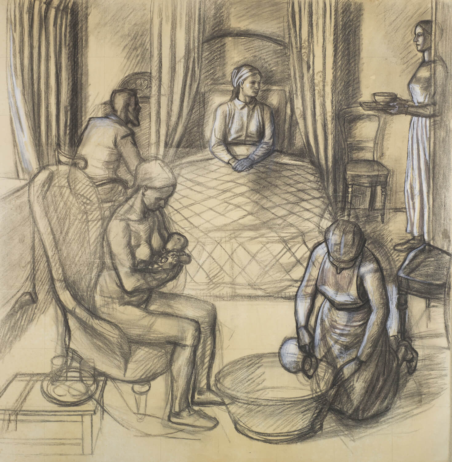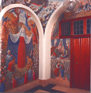Mahoney was commissioned to produce a mural scheme for the Lady Chapel at Campion Hall in 1941. The scheme was to be made up primarily of three large panels: the Nativity and Adoration of the Shepherds, the Coronation of the Virgin, and Our Lady of Mercy. In detail and composition the paintings owe much to early Italian example. The most notable case is Our Lady of Mercy (Autumn), clearly inspired by Piero della Francesca’s altarpiece at Borgo San Sepolcro. Electing to paint directly onto canvas fixed to the walls and by daylight hours only, the project inevitably became drawn out and Mahoney could only work in situ during the Easter and summer vacations when he was not teaching. The project continued into the following decade and coincided with a serious decline in the artist’s physical health. In spite of these problems, Sir John Rothenstein, who chose to reproduce one of the murals as a plate in British Art since 1900 (1962, pl.60), was moved to describe the scheme as as second …only to that by Stanley Spencer at Burghclere.