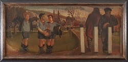 Primarily a painter of portraits and landscape, Spencer’s reputation, like that of his brother Stanley, rests equally on his ability to capture the incidents of everyday life in rural England. After seeing Football on Cookham Moor hanging in the house of author, George Behrend, in 1942, Stanley wrote to Gilbert: