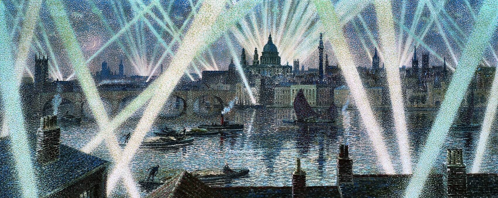Little is known of Barry’s activities during the war, but in 1940 he was already in his late fifties and based in St Ives. A committed pacifist, he was in any case too old for active service. This little-known but remarkable painting, his magnum opus, dramatically depicts Christopher Wren’s great St Paul’s Cathedral, seemingly standing in defiance of the Nazi onslaught taking place. Inspired by C.R.W. Nevinson’s dynamic treatment of searchlights in his work, and by Georges Seurat’s pointillist technique, Barry has gone further and created this night-time scene by regrouping buildings to form his subject, showing London’s major buildings on the skyline, notably celebrating Wren’s Monument and his distinctive City church towers.