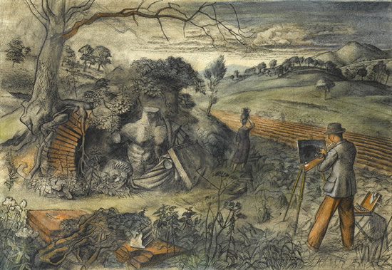 Returning from Rome in 1930, Sorrell produced some very fine works: Artist in the Campagna (c. 1931), Appian Way (1932), Rocky Formation at Thingvellir (1934), The Long Journey (1936), A Land Fit for Heros (1936). Sorrell’s vision was born out of the Romantic British tradition exemplified by Blake, Palmer and their 20th-century disciples.