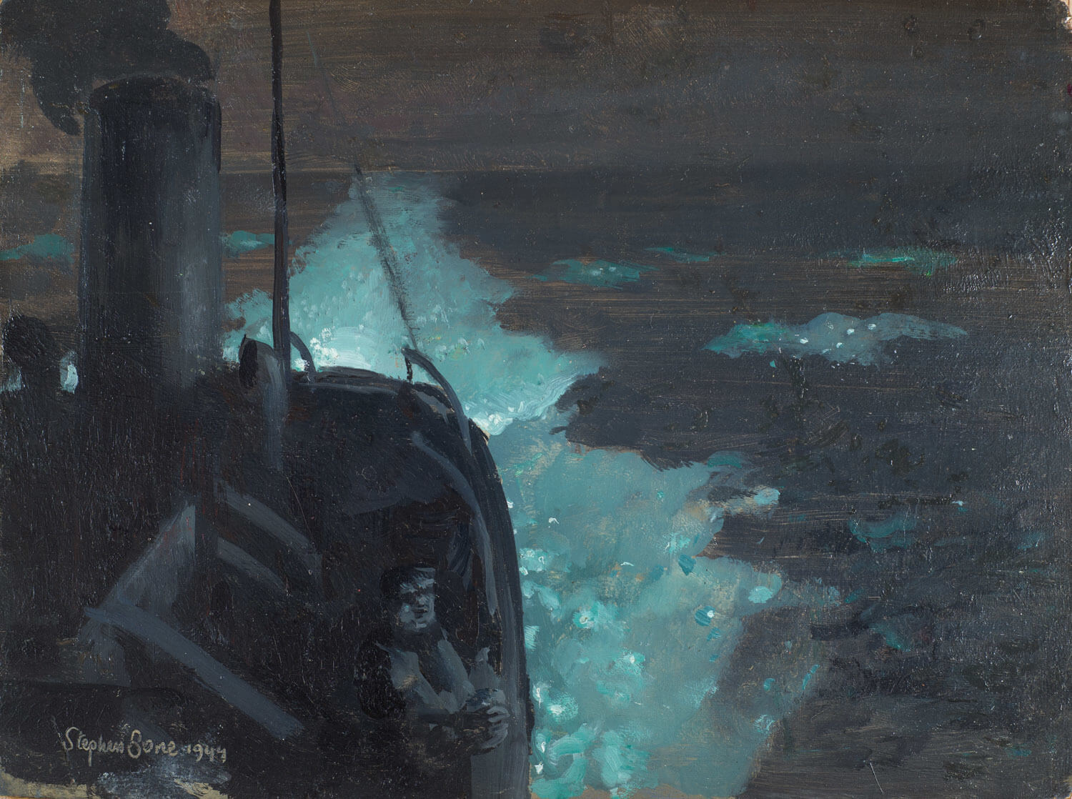As a war artist attached to the Admiralty, Stephen Bone recorded the Normandy landings in 1944. This panel which shows a small ship steaming through the night very possibly relates to his eye-witness account of this momentous event.