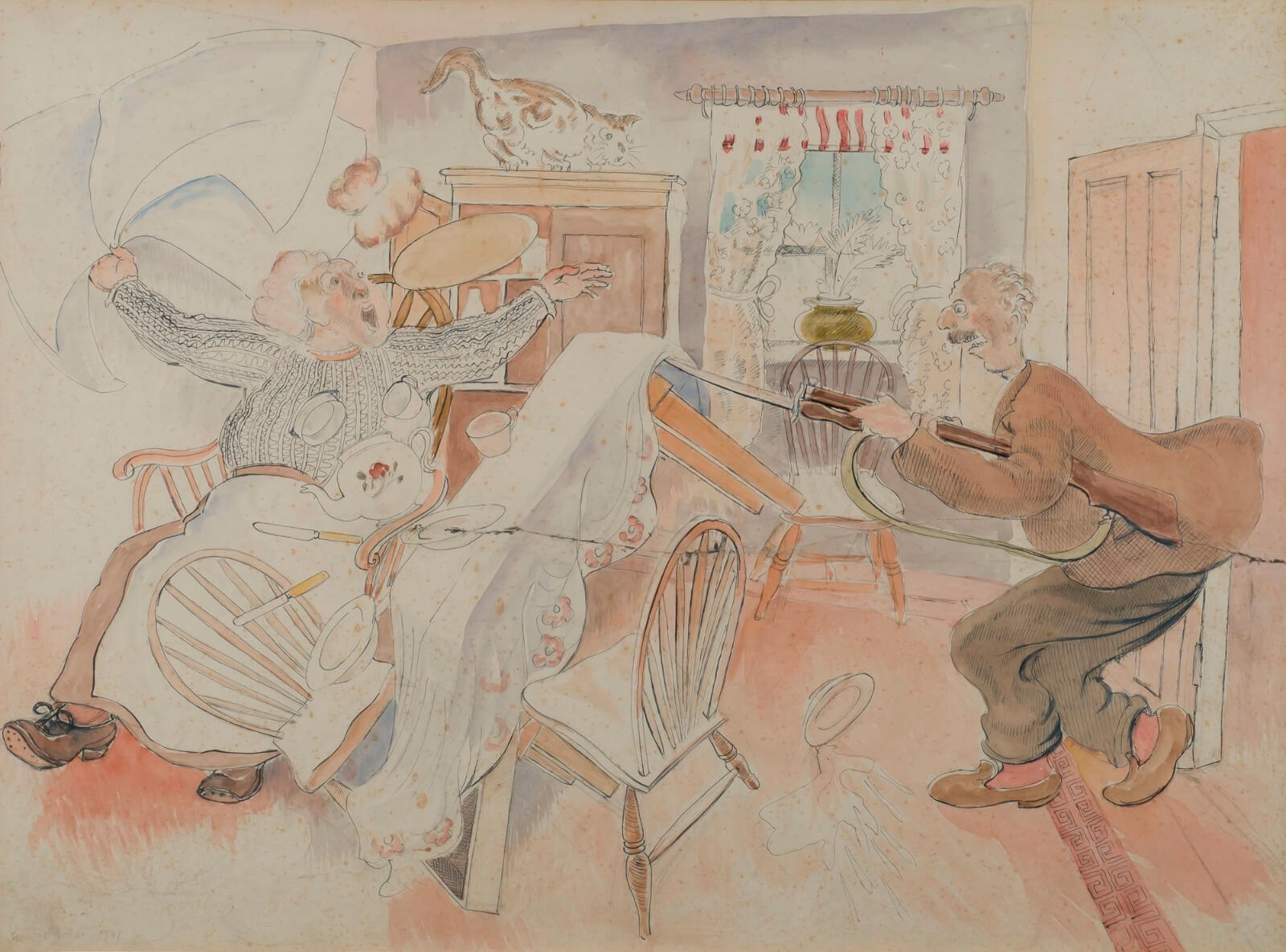 From 1941 Spencer worked with the Royal College of Art at Ambleside in the Lake District. Too old to serve in the army Spencer was active in the Home Guard as a subsection leader. His witty observations of life in the Home Guard were captured in a series of fourteen large watercolours, which were intended for publication. The publication however had to be abandoned after the watercolours were intercepted by the Royal Mail, on their way to the printers, and ripped along one side (subsequently repaired by Spencer) as an act of censorship.