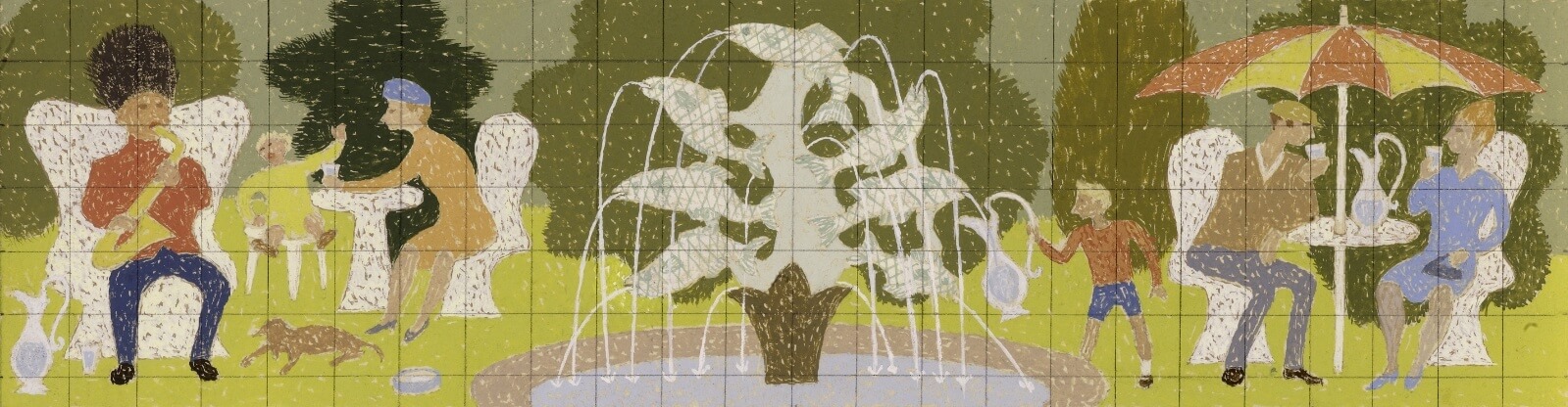 Armstrong wrote a detailed commentary on the composition: ‘Bandsmen and children everywhere, that is the keynote of the Park. The bandstand is too small, it will hold only the conductor and the big drum. The rest of the band sit here and there wherever they feel disposed, with a kind of stereophonic effect.’ Besides the P.L.Travers reference, there’s a Dylan Thomas-ish Under Milk Wood feeling to the events. A little girl brings goldfish for her grandfather to catch. ‘He has been fishing all morning,’ wrote Armstrong, ‘and has had no luck. Her aunts are also bringing the stuffed fish off the chimney-piece.’ Frivolity meets anarchy in mutual admiration: there’s a Stanley Spencer-ish note to the festivities, a breath of unexpected love among the participants. Armstrong’s text concludes: ‘On the right a bandsman gives up and wipes his forehead. He has got a pint from somewhere…. The lake mermaid has come out to have a better view and has found a boy-friend. On a seat the poet and his muse meditate.’ (Andrew Lambirth, British Murals & Decorative Painting 1920-1960, Sansom & Co, 2013, pp.286-87)