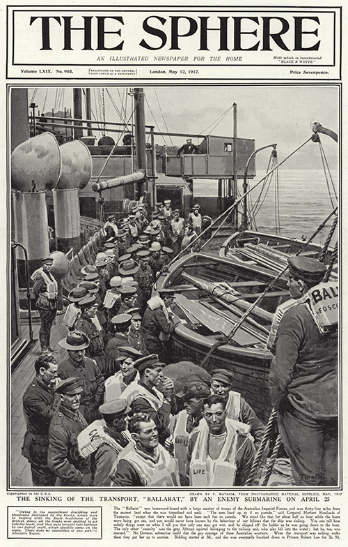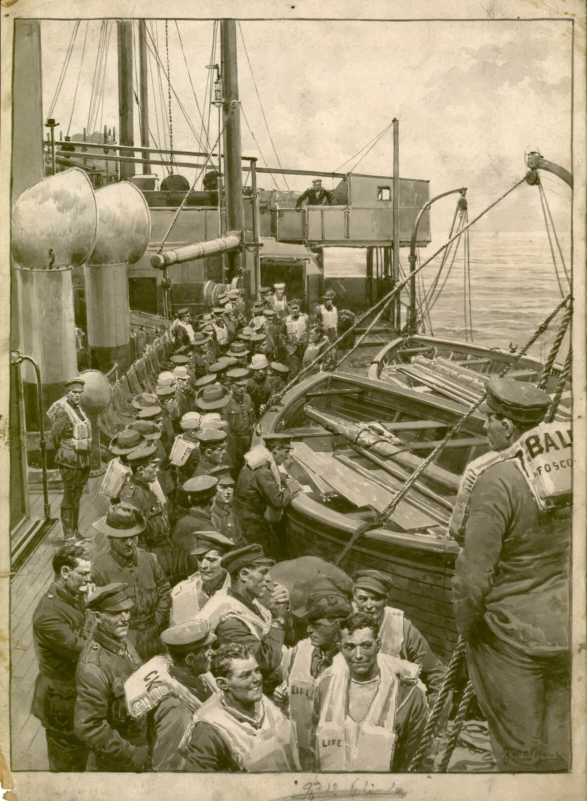 The scene depicts the Ballarat on April 25th 1917 homeward bound with a large number of Australian troops on board when she was torpedoed by a German submarine. The troops lined up in order to man the lifeboats.