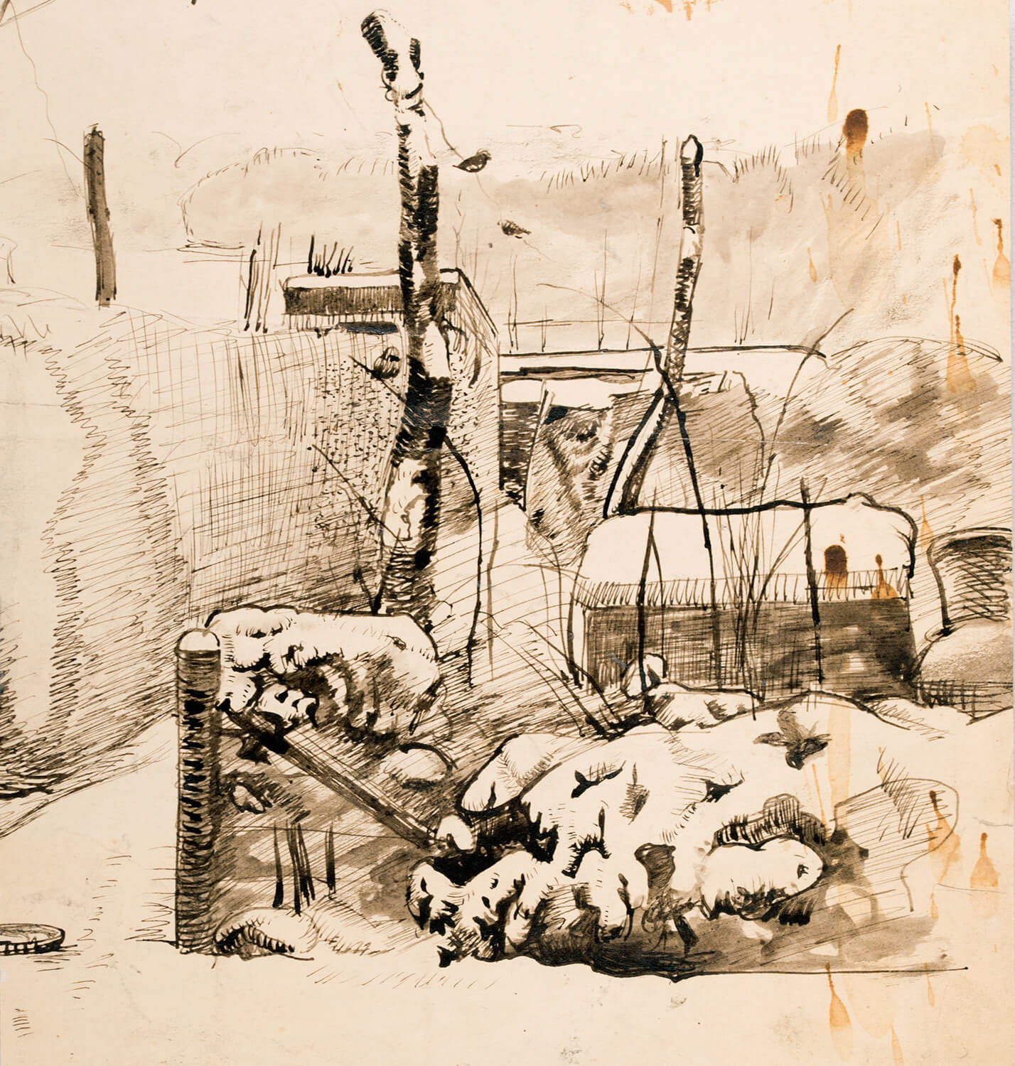 Pen and ink on brown paper