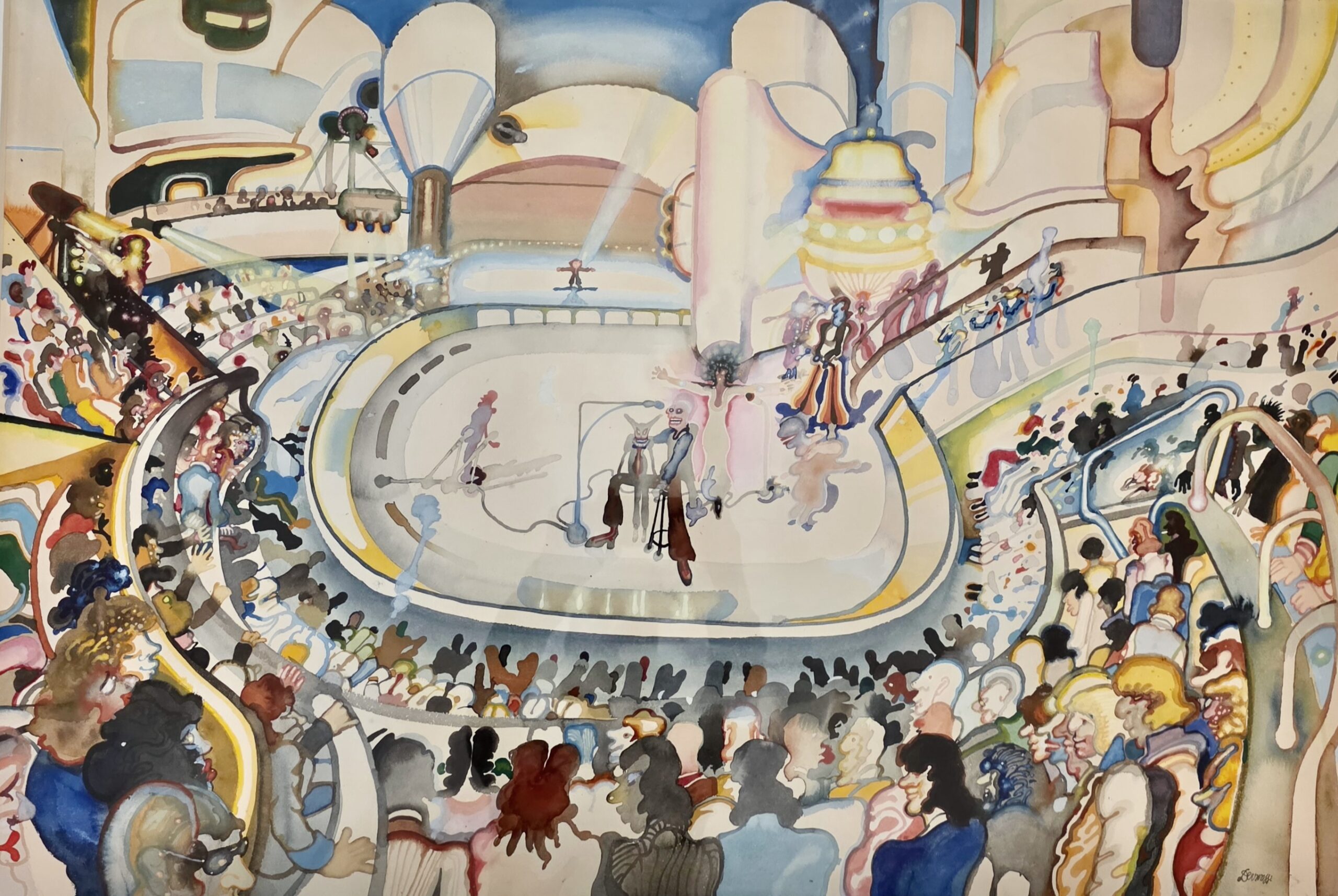 Urban subjects similar to the repertoire of L.S Lowry (1887-1976), unfold against a backdrop of factories, concerts halls, sporting arenas,  beaches, cafeterias and bars, museum interiors and shopping centres. Bill-boards, traffic congestion and fast food are very much in evidence.   Night clubs are peopled predominantly by men (and the occasional drag-queen), a celebration of Evans’ homosexuality.   Evans made his living whilst in London running a small classical music record shop, Record Roundabout, at 291 Brompton Road.