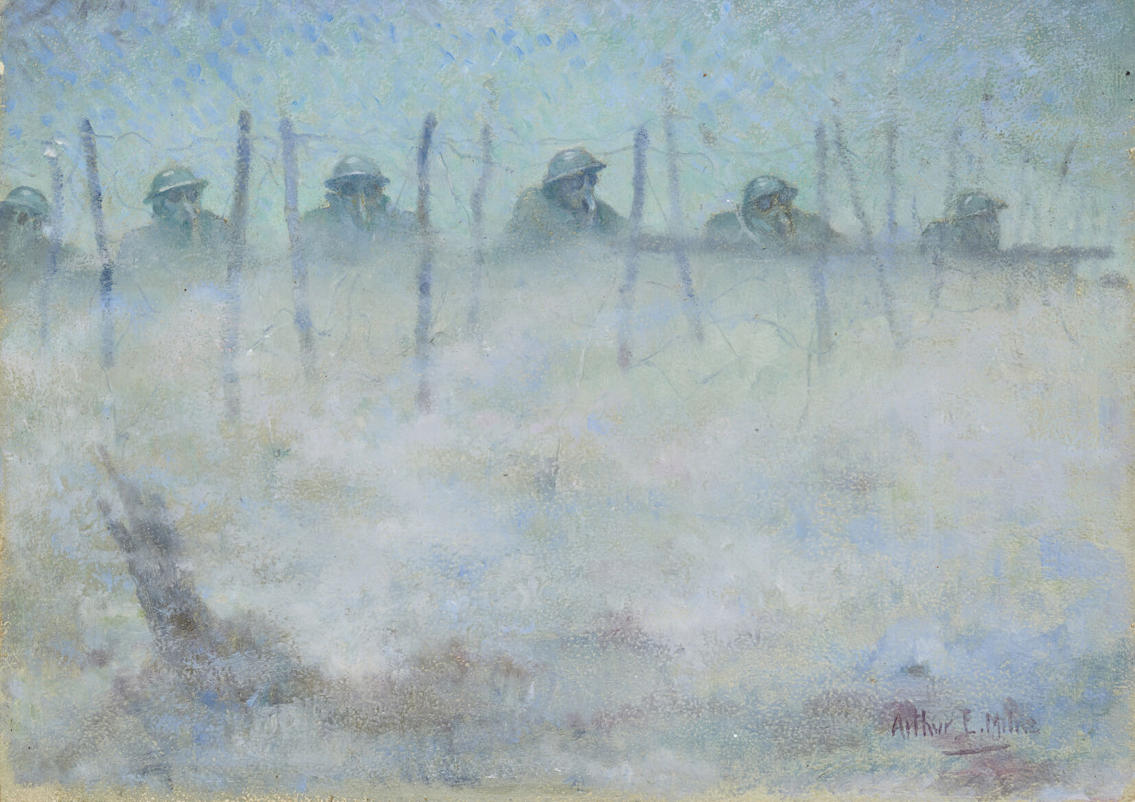 Milne was in his mid twenties when WW1 started, having just completed a five year training at the Edinburgh School of Art. This image is likely to have been painted on the spot when Milne saw active service in France.