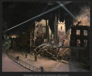A number of his works are in public collections including two WW2 scenes in Bristol Art Gallery showing fire fighting subjects. Too old to serve during WW2 Milne is likely to have himself served as an auxillary fireman or in some other capacity on the Home Front.