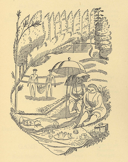 This is the Bawden drawing of a picnic at the Willow Grove, Great Bardfield, that appears as an illustration for July in Ambrose Heath’s Good Food. It would have been done in the summer of 1932.
