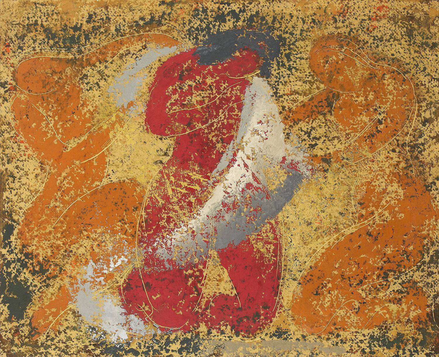 Abstract in dark blue, red, brown green and yellow, 1950’s