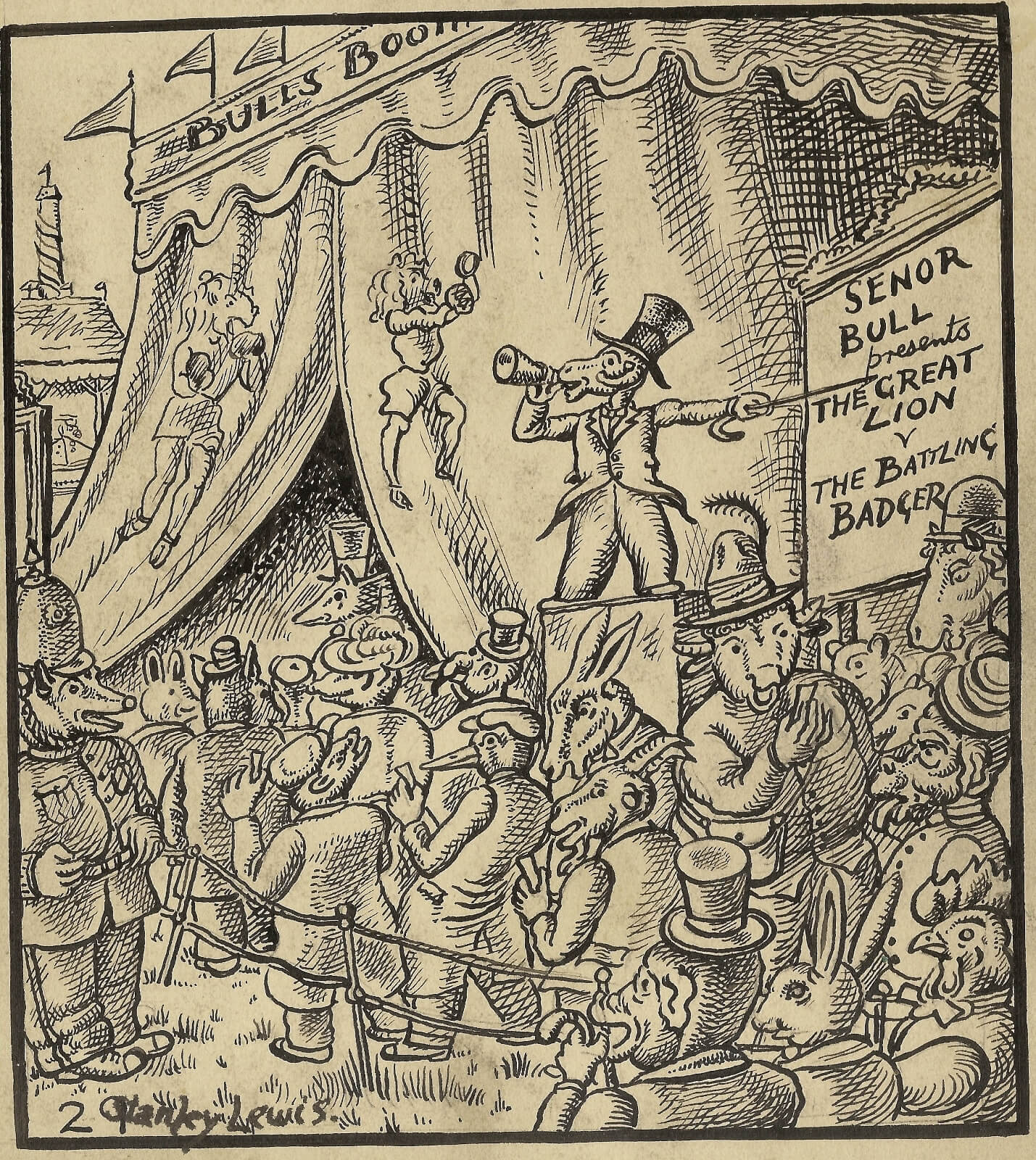 Stanley Lewis (1905-2009) was reluctant to sell his art during his life-time. He kept all his major works. He later gave some to museums. He turned down offers from galleries, preferring to work without constraints, choosing to earn a much needed regular income through teaching (over 10 years at Newport School of Art and 22 years as Principal of Carmarthen School of Art). Stanley’s art has period charm. It occupies a backwater (rather than the mainstream) of British Art – this is the unmapped territory that art historians will increasingly look at as accounts of 20th Century British Art are revised. His work is highly distinctive and he remained faithful throughout his life to a graphic and stylised manner developed early on in his career. Perhaps the most enduring aspect of his legacy is the remarkable cycle of paintings exhibited at the Royal Academy celebrating Welsh subjects: The Welsh Dress, The Welsh Mole Catcher, The Welsh Farmer, and The Welsh Dresser. There is arguably no other series of genre paintings in British Art which capture so evocatively Welsh identity. Stanley also strongly identified with the land: on the one hand his calling to art was a vocation; on the other his approach was disarmingly unpretentious: ‘I must admit instinct has kept me on the straight-and-narrow path to carry on working my art into what I am: I am a farmer’s son and I have never craved to be in any one else’s shoes.’ Stanley produced little in the way of major paintings during the last decades of the 20th century, though he did continue to draw, (often reworking earlier drawings), and increasingly put his energy into producing and publishing his book illustrations. In his 101st year, in 2006, Stanley published a last edition of drawings under the title: Adventures in Animal Town, using computer software (Photoshop) to add colour to the remarkable images which half a decade earlier, in black and white, had graced the pages of the South Wales Evening Post. (Fig. 2) Stanley first contacted Liss Fine Art (by email!), aged 101, wanting to know what had happened to his former mentors Thomas Monnington and A.K. Lawrence. Stanley’s career spanned a large part of the 20th century. Yet the fruit of his labour was never publicly exhibited. This is the first ever exhibition of his work. Stanley put his longevity down to cigars, whisky and Michelangelo. He took great pleasure in helping prepare the notes in this catalogue. Recalling events from between 50 and 90 years ago it is remarkable how accurate his memory proved to be. It is sad that Stanley is not alive to see this exhibition. Asked, age 103, if he was finally ready for his first ever show, or whether he would like a little more time to prepare, he inhaled gently on his cigar and, with a puff of smoke and a faint chuckle, said: ‘I think I am ready’. The day before he died he asked Jenni his daughter to type up his final wishes: ‘… And when my exhibition is up and running, open a good bottle of champagne and celebrate and think of me. No doubt I will be there in spirit to keep an eye on things.