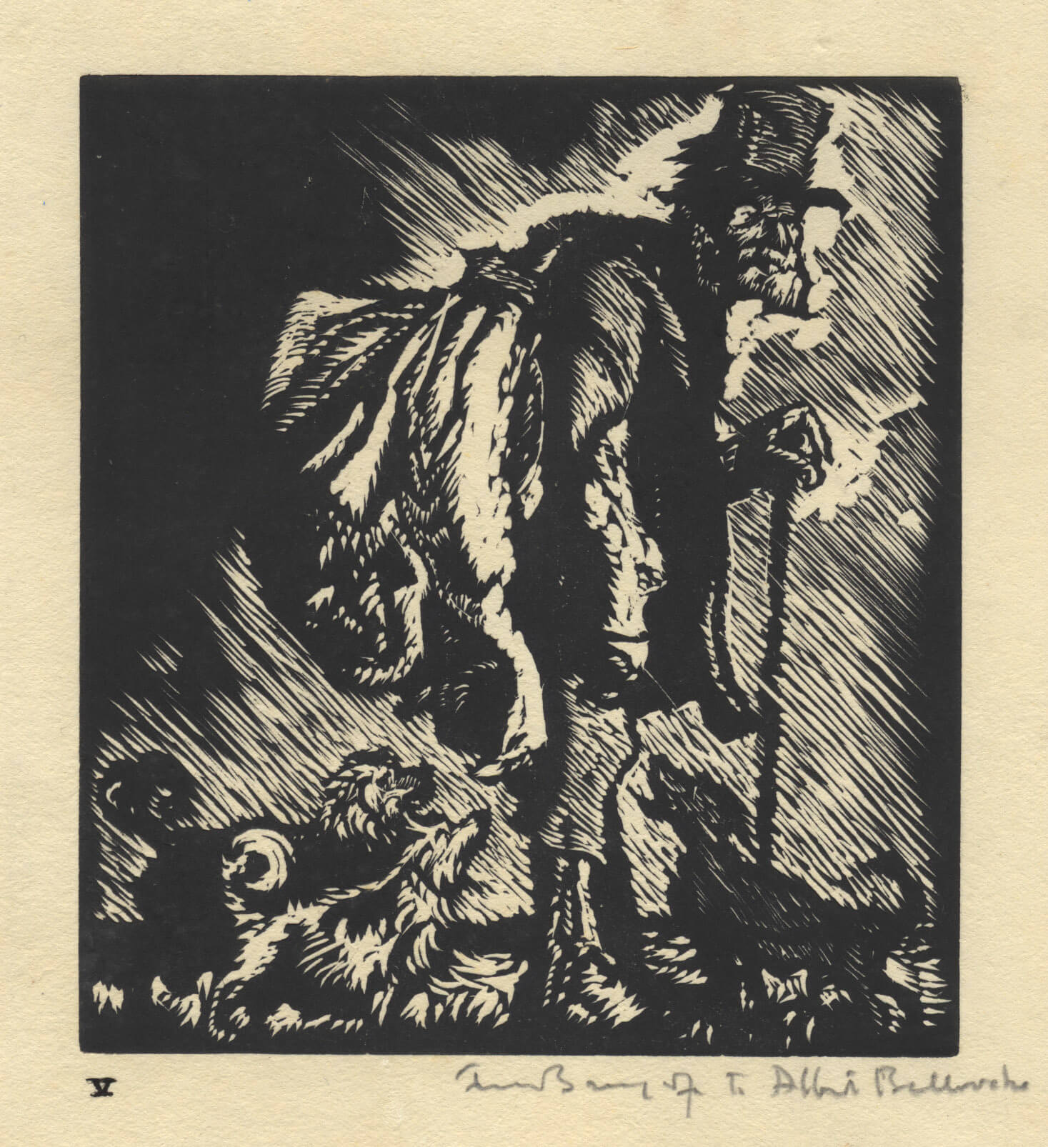 Frank Brangwyn was born in Bruges, Belgium, the son of an English father and Welsh mother. The family returned to London in 1874, Brangwyn’s father gaining work as a designer of buildings, embroideries and furniture. Although Brangwyn appears to have had little formal education, whether academic or artistic, his earliest mentors were three of the most influential men in design at the turn of the century: Arthur Heygate Mackmurdo, William Morris and Siegfried Bing. Between 1884 and 1887 Brangwyn travelled to Kent, Cornwall and Devon, before venturing further with trips to Turkey in 1888, South Africa in 1891, Spain in 1892 and Morocco in 1893.