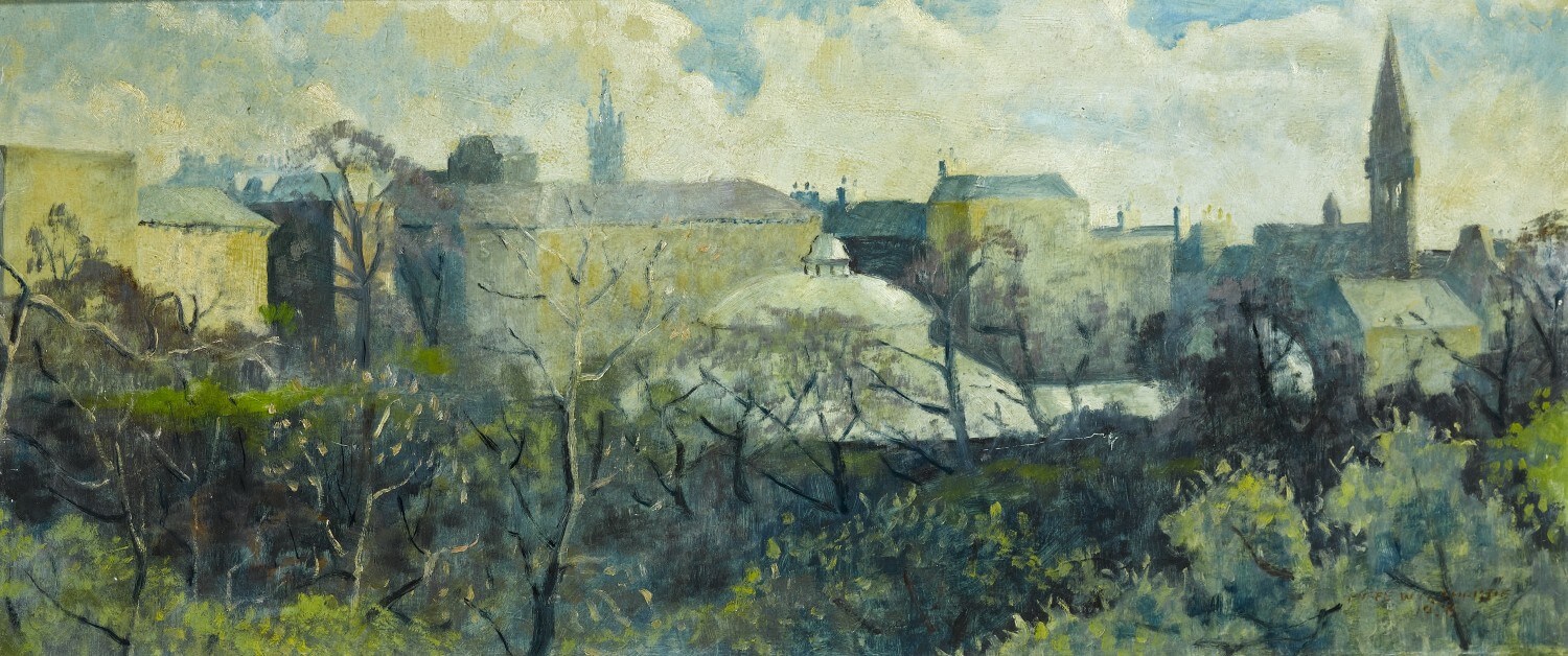After Fyffe and Eleanor married in 1952 they rented a flat in Queen Margaret Drive and moved in 1953 around the corner to a first floor flat overlooking Botanic Gardens, with one large living /dining room/ studio, and one small bedroom adjoining, sharing a tiny kitchen and bathroom with the other tenants.  This is a view from the window – a record of a very happy three year period spent in the flat. At this time Fyffe started teaching and also worked on the Piping college mural and, with Walter Pritchard, the mural in St Francis in the East .