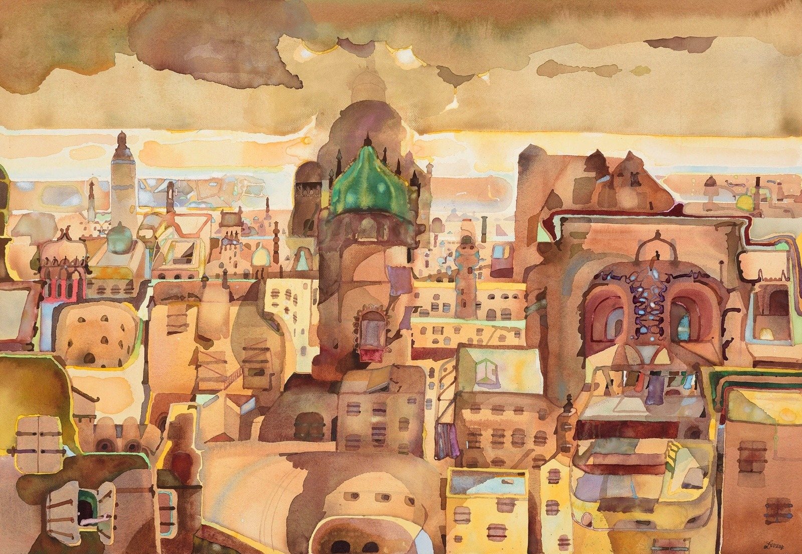 The highly distinctive large scale watercolours of David Evans have much in common with those of Edward Burra, who, twenty four years his senior and much admired by Evans, was clearly an important influence. Painting the landscape of his native Suffolk, where he settled (near Woodbridge) in 1969, his brightly coloured compositions, which typically measure 30 x 50 inches, fused his local habitat with vivid fantasies inspired by imagery from contemporary life.