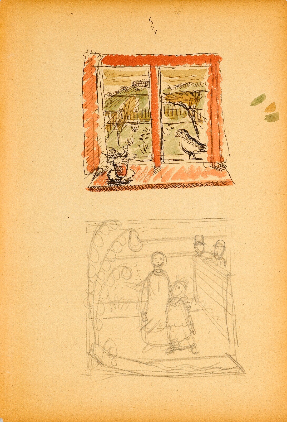 Window sill with flower pot and bird, Mother and child in garden, 1935
