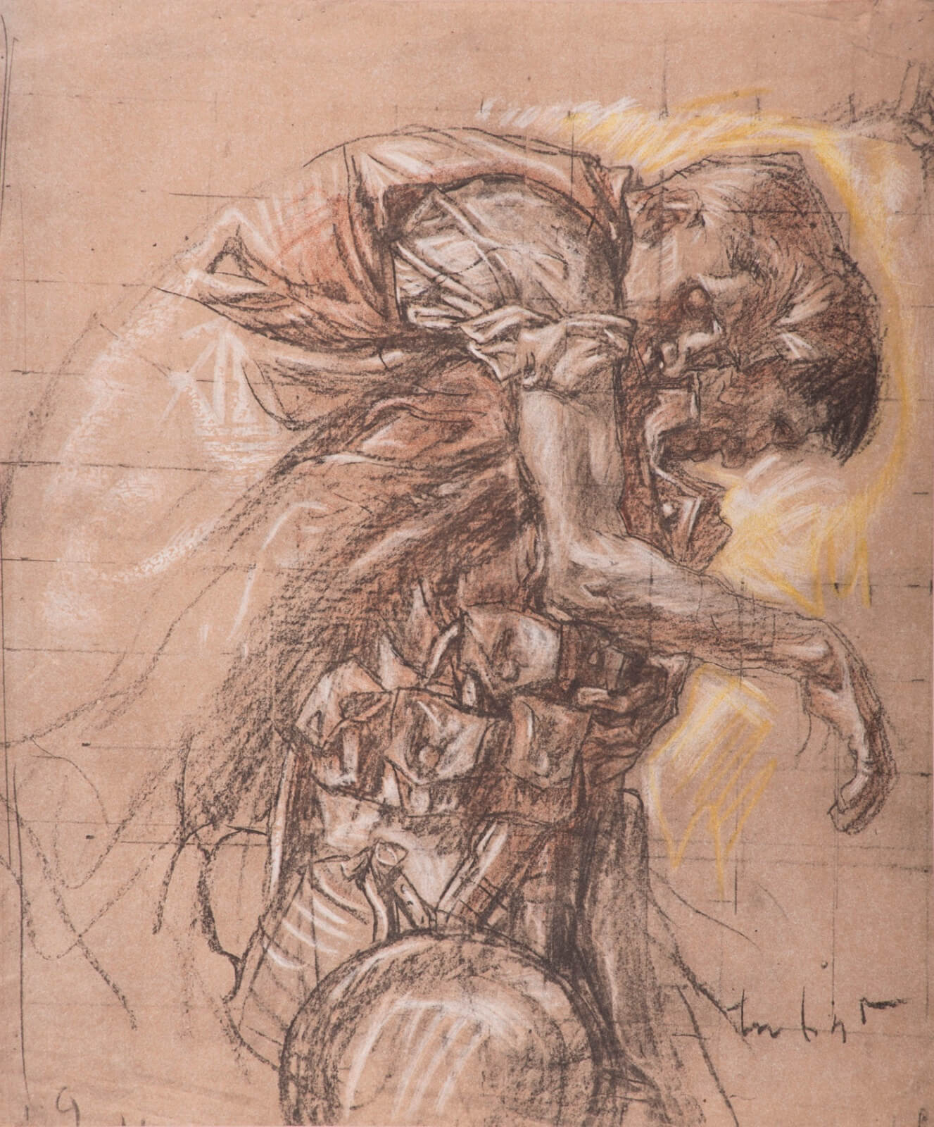 We are grateful to Libby Horner for assistance. Wounded Soldier (study for M1403) will appear as no. (D1564) in her forthcoming Brangwyn Catalogue Raisonne. The whereabouts of the original drawing is unknown; the drawing appeared as no 86 in the Steinlen Portfolio.